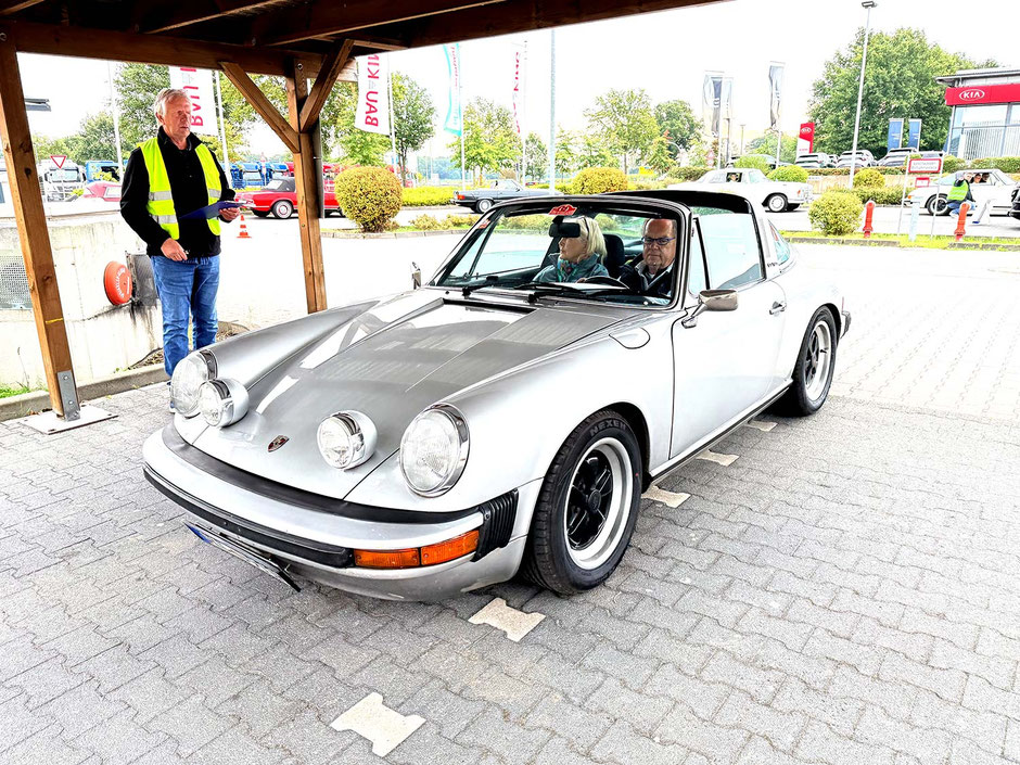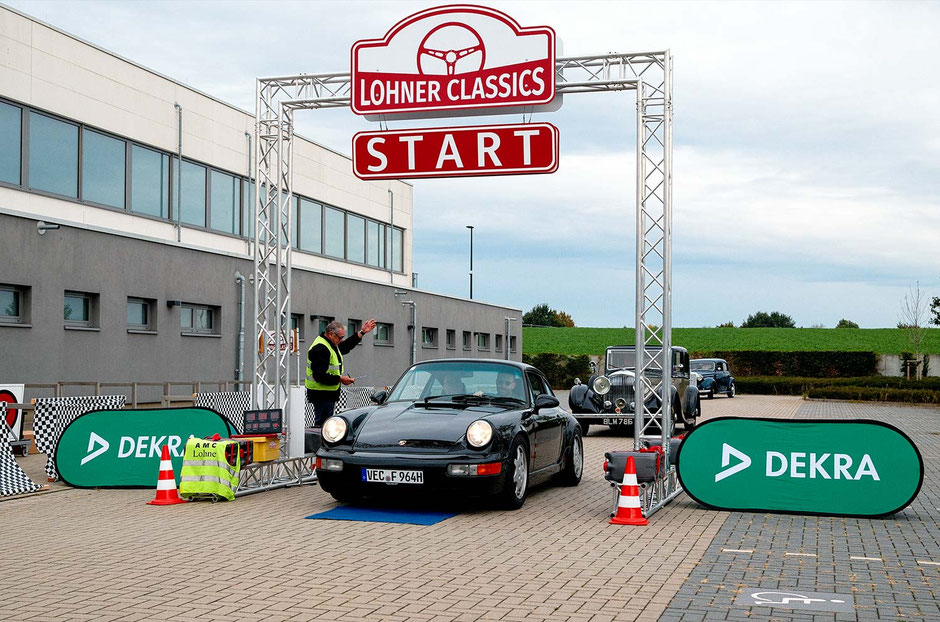 Dann ging, nach recht interessiertem Studium der Bordunterlagen und kurzer Grußansprache durch das Orga-Team mit Info zum geplanten Tagesablauf, der schöne, schwarze 911er Porsche, Typ 964, mit Startnummer 1, dem Sieger der letzten Lohner Classics, zugestanden, als Erster vom Starter angezählt, exakt um 9.31 Uhr, auf die Fahrroute.