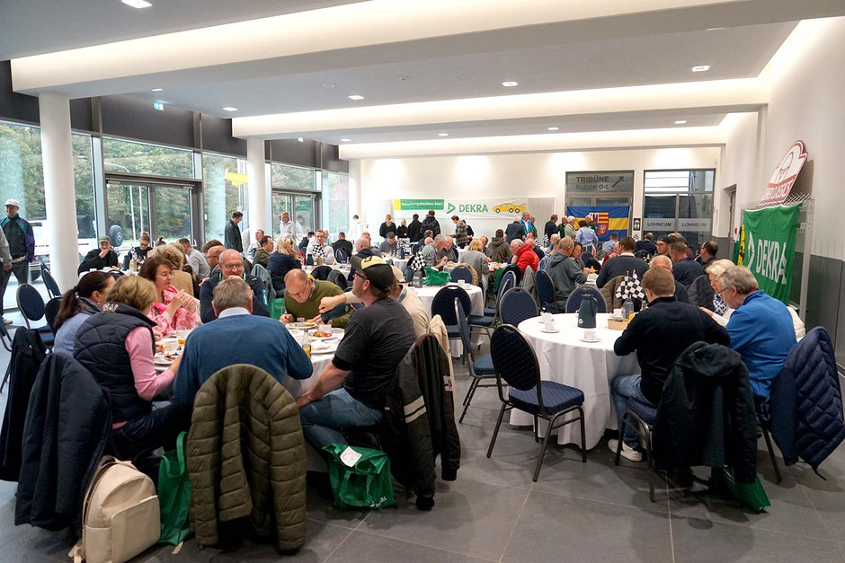 Alle Teilnehmerfahrzeuge konnten bewacht und kompakt auf einem asphaltierten Speditionshof gegenüber dem Restaurant abgestellt werden. Der Hofbesitzer freute sich so sehr auf den Sonderfuhrpark auf seinem Hof, dass er auf das Dach seines Hauses kletterte, um selbst für sich ein paar Schnappschüsse der schicken Ansammlung von den rollenden Raritäten mit seiner Kamera einzufangen.