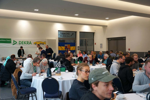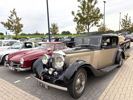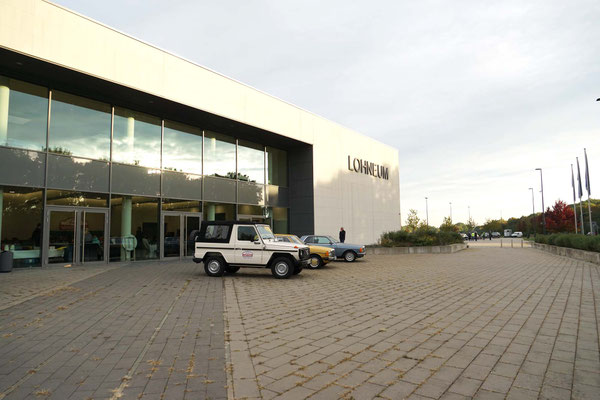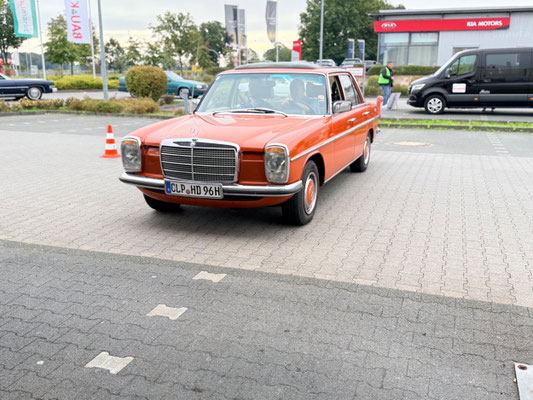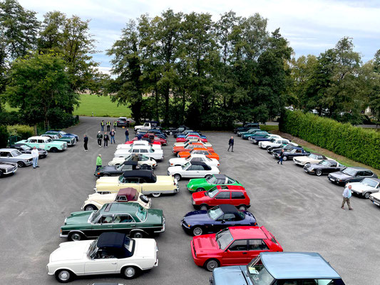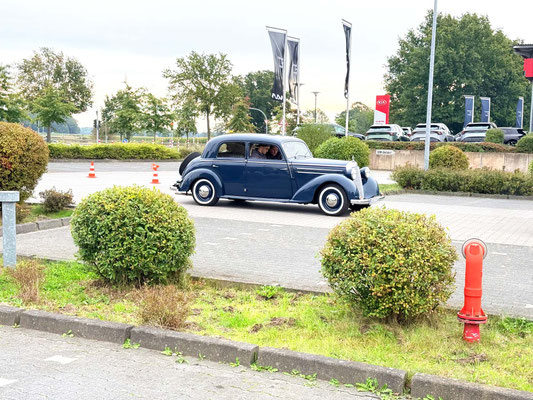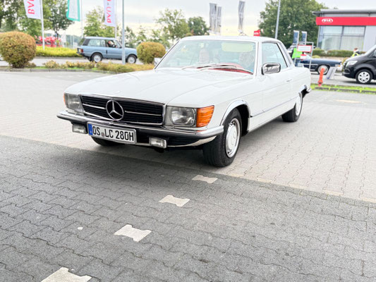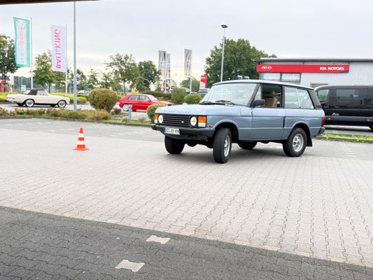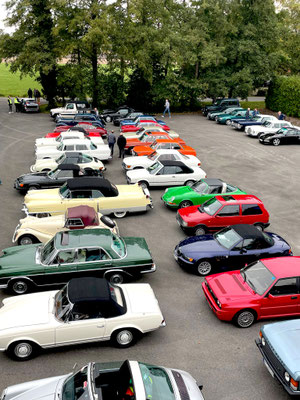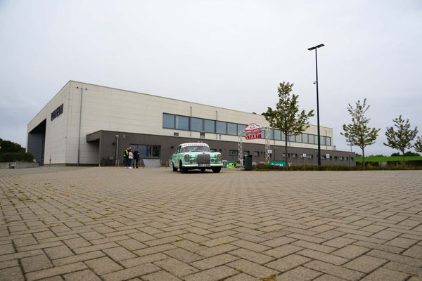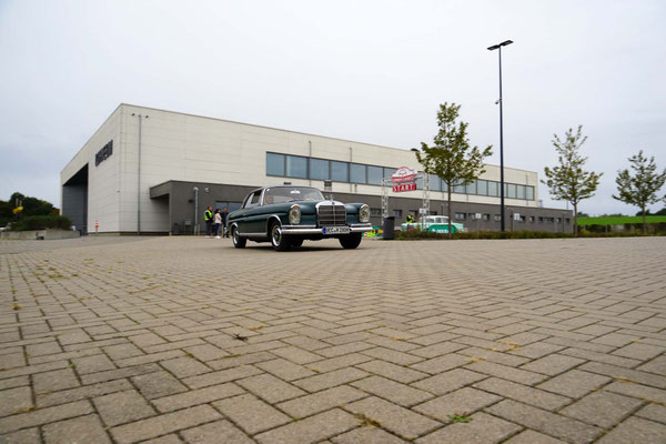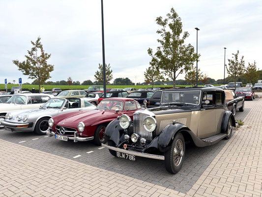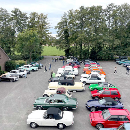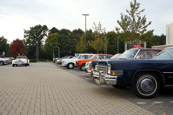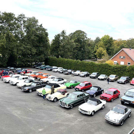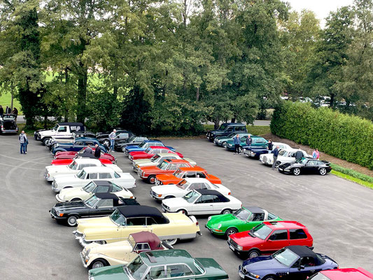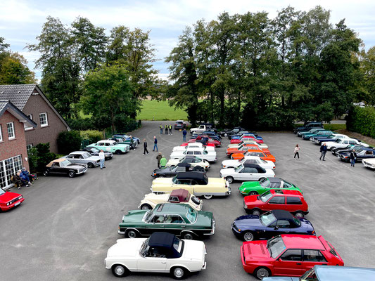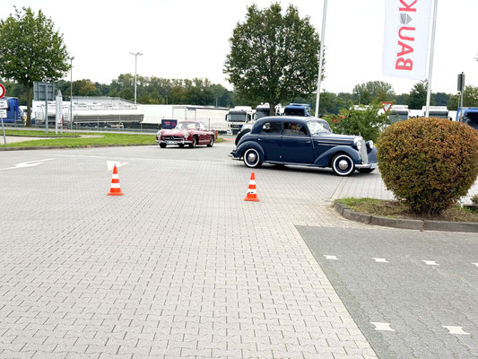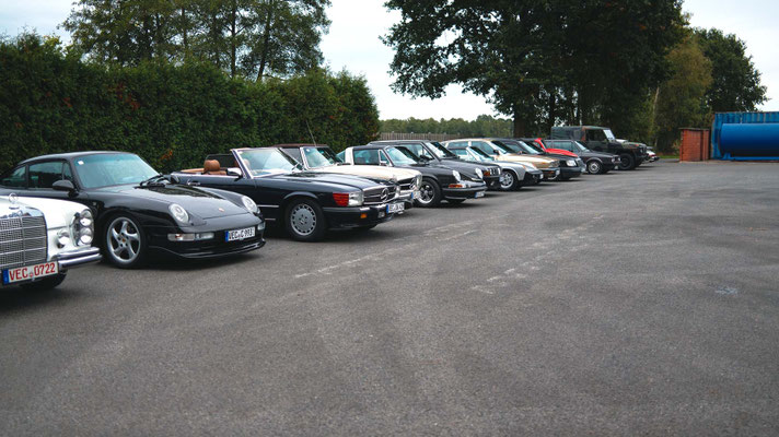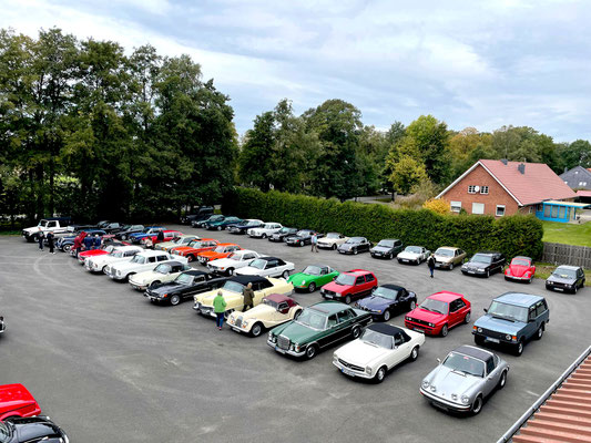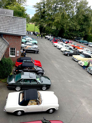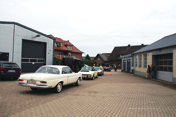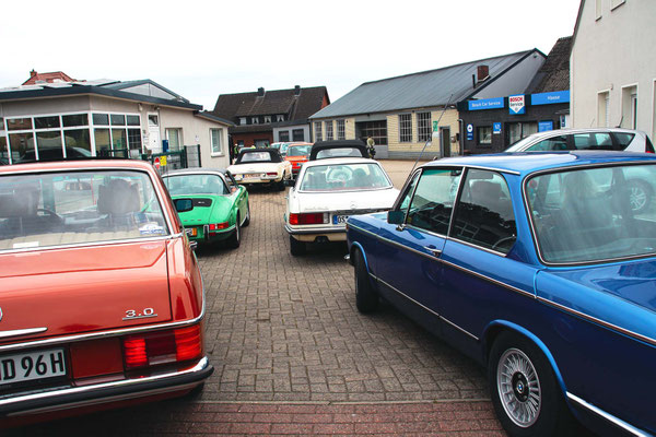 Alle Teilnehmerfahrzeuge konnten bewacht und kompakt auf einem asphaltierten Speditionshof gegenüber dem Restaurant abgestellt werden. Der Hofbesitzer freute sich so sehr auf den Sonderfuhrpark auf seinem Hof, dass er auf das Dach seines Hauses kletterte, um selbst für sich ein paar Schnappschüsse der schicken Ansammlung von den rollenden Raritäten mit seiner Kamera einzufangen.