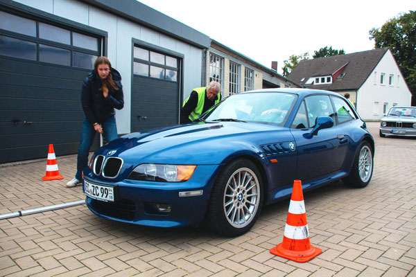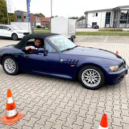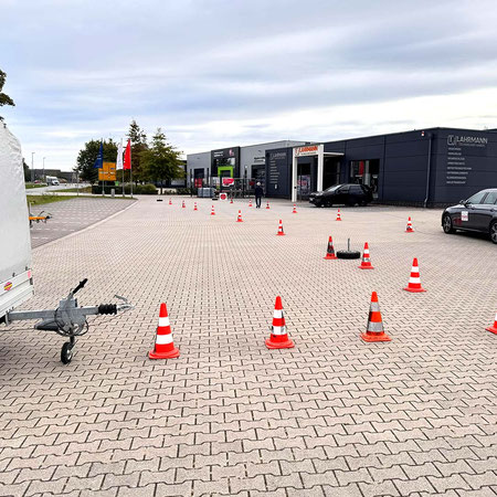 🔧 Beim Hagebaumarkt in Quakenbrück war dann bei der zweiten Aufgabe wiederum Präzision gefragt: Die Fahrer sollten ihr Fahrzeug möglichst in einem Zug mittig unter einem großen Doppelcarport aus Holz einparken, was ein sehr gutes Gefühl für die Fahrzeugdimensionen abverlangte.