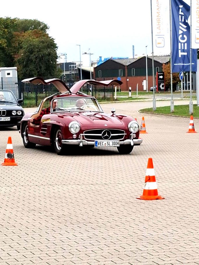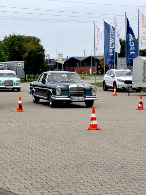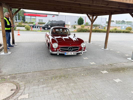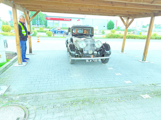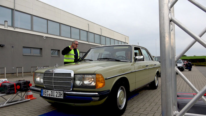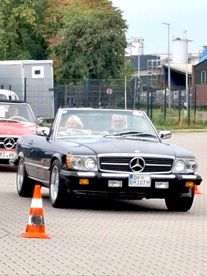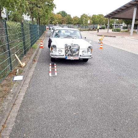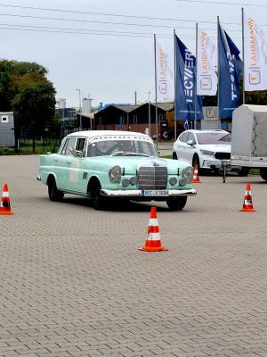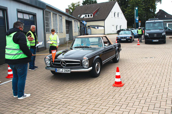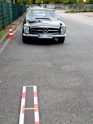 Team mit der Startnummer 22 und Driver Lennard Hilgefort hat sein geführtes großes Fahrzeug vom Typ Mercedes-Benz SL 500 genau mittig eingeparkt. Das muss man erst mal schaffen, mit einem geliehenen Benz. Klasse! Fies war, dass die weiße Bodenmarkierung nicht mittig im Carport verlief.