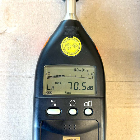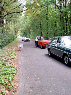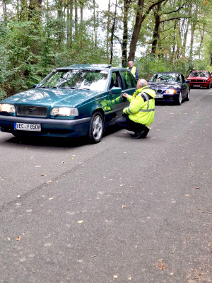 Hier war es auf der Nebenstraße sehr herbstlich. Das war gut, denn dann kam die fünfte Herausforderung. Die Lautstärke der Hupe wurde mit einem Schallpegelmessgerät gemessen. Der Fahrer sollte den gemessenen Wert schätzen. Das war eine ungewöhnliche, aber lustige Aufgabe. Laut Gesetz sind 105 dB in sieben Metern Abstand die Obergrenze. Jede alte Hupe klingt anders. Einer konnte nicht hupen. Er rief laut "Hup" ins Messgerät - hahaha.