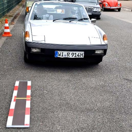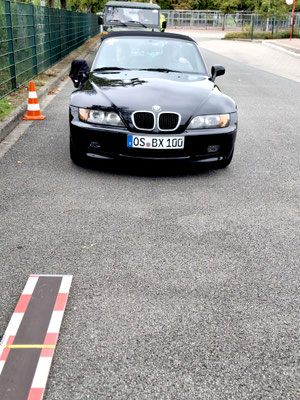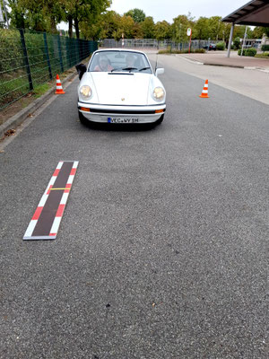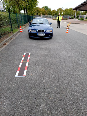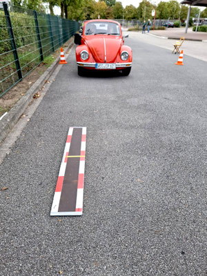 Die nächste und somit dritte Herausforderung lauerte dort am großen Schulbusparkplatz auf das Fahrpersonal. Es sollte das „Brett Pit“ mit dem Vorderrad überrollt werden, um dann mit dem Hinterrad auf dem am Brett aufgebrachtem gelben Mittelstrich genau zum Stehen zu kommen.